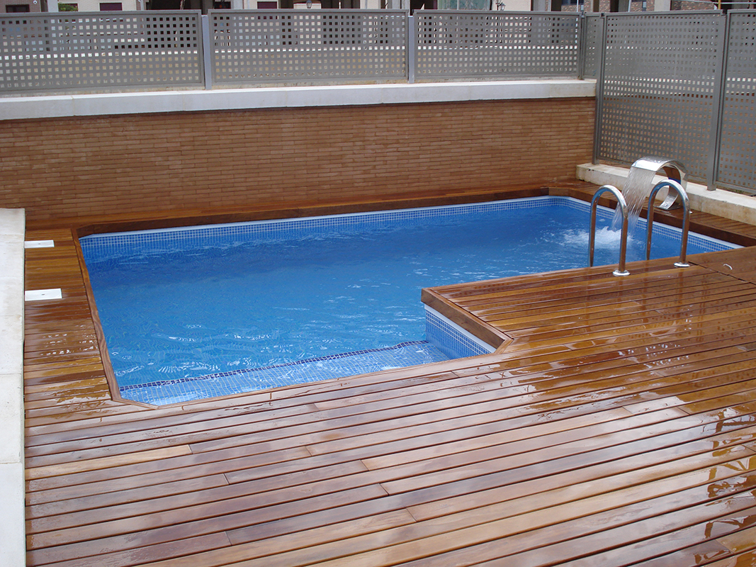 Piscina equipada con cascada-masaje y focos led. La terraza y coronación se han revestido con una tarima maciza exterior de Ipe y para el interior de la piscina se ha colocado un gresite azul niebla.